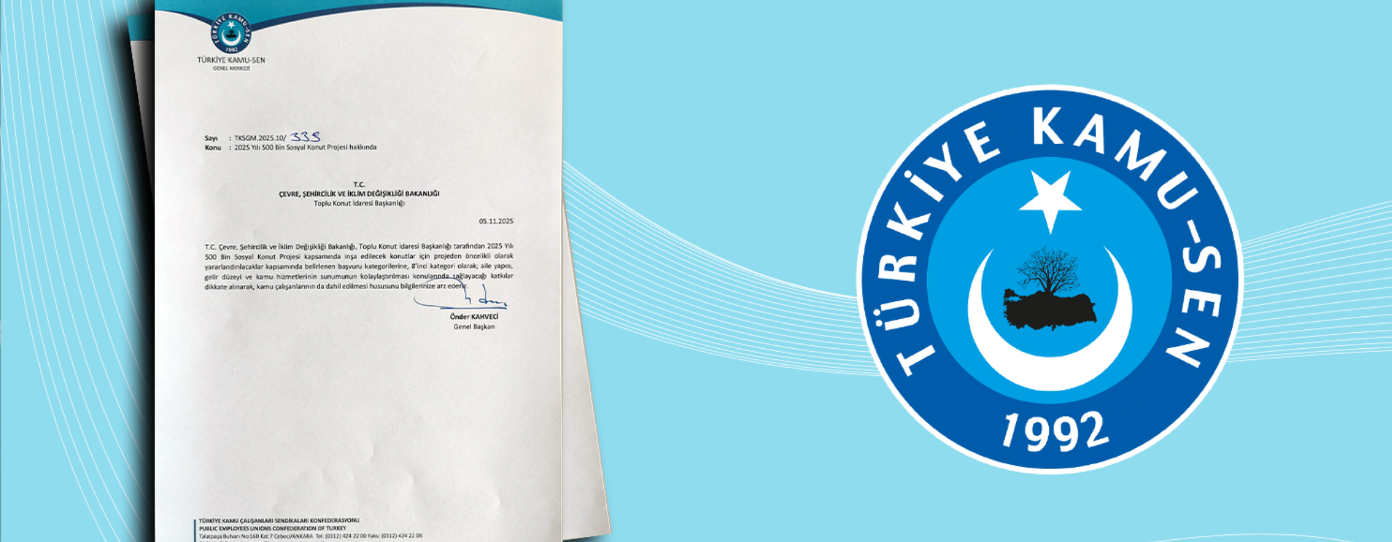 500 Bin Sosyal Konut Projesinden kamu çalışanlarının da öncelikli olarak faydalanabilmelerinin sağlanması amacıyla Çevre, Şehircilik ve İklim Değişikliği Bakanlığı'na başvurduk.