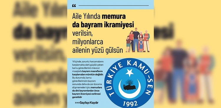 Bu yıl, Aile Yılı olarak ilan edilmiştir. Bayramlar, aile olma bilincinin pekiştiği, birlik ve beraberlik duygularının doruğa çıktığı, manevi iklimimizin şenlendiği önemli dini ve kültürel günlerimizdir. Bayramlarda çocuklara verilen harçlıklarla, aile ziyaretleri ve hediyeleşme yoluyla kardeşlik bağlarımız pekişir. Ne yazık ki uzun bir süreden beri memurlarımız bayram sevincini ve coşkusunu yaşayamamakta, çocuklarına, torunlarına bayramlık alamayan, harçlık veremeyen anne-babalar, başı önde gezmektedir.