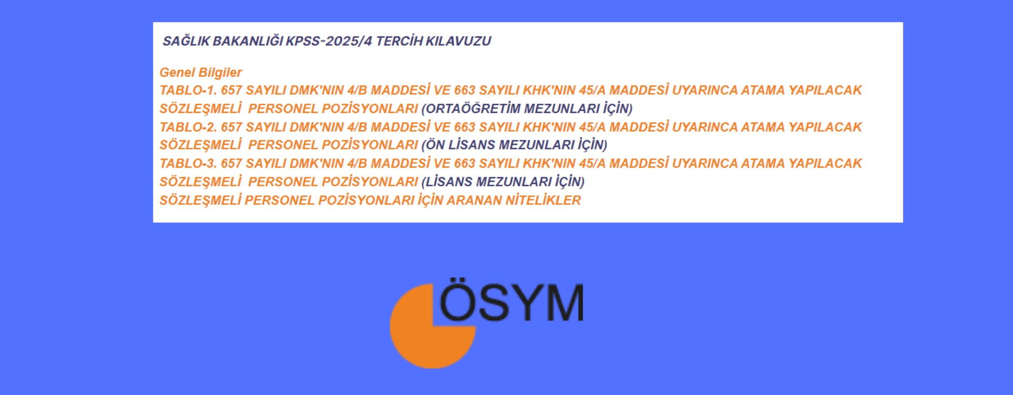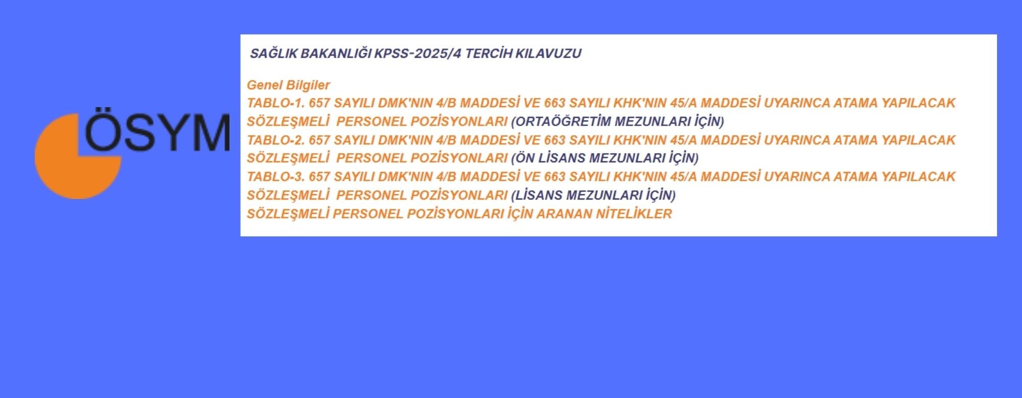 Sağlık Bakanlığının sözleşmeli sağlık personeli pozisyonlarına, 657 sayılı Devlet Memurları Kanunu’nun 4/B maddesi ile 663 sayılı Kanun Hükmünde Kararname’nin 45/A maddesi kapsamında istihdam edilmek üzere ÖSYM tarafından yerleştirme yapılacaktır. Adaylar, KPSS-2025/4 Tercih Kılavuzu’na aşağıdaki bağlantıdan erişebilecektir.