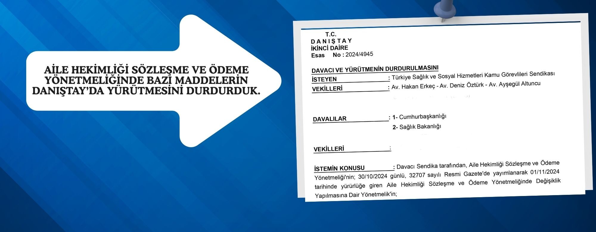 30.10.2024 tarih ve 32707 sayılı Resmî Gazetede yayımlanarak yürürlüğe giren Aile Hekimliği Sözleşme ve Ödeme Yönetmeliğinde Değişiklik Yapılmasına Dair Yönetmelik’e karşı Danıştay nezdinde açmış olduğumuz davada;